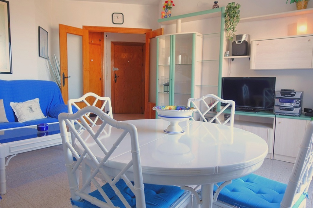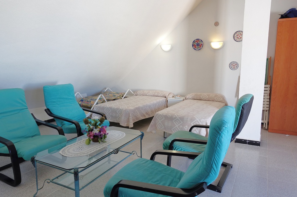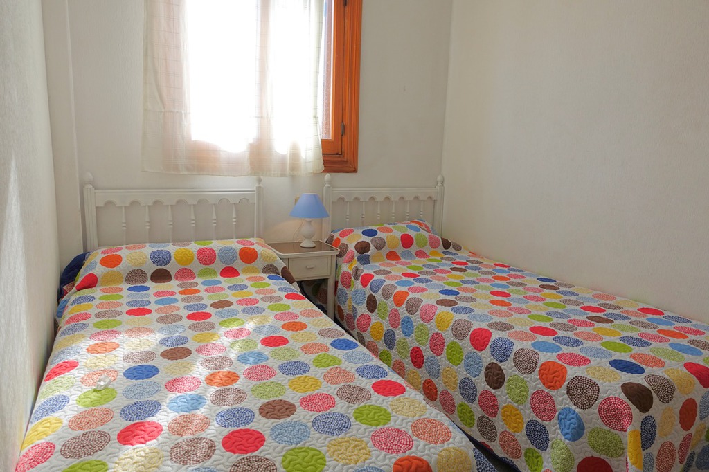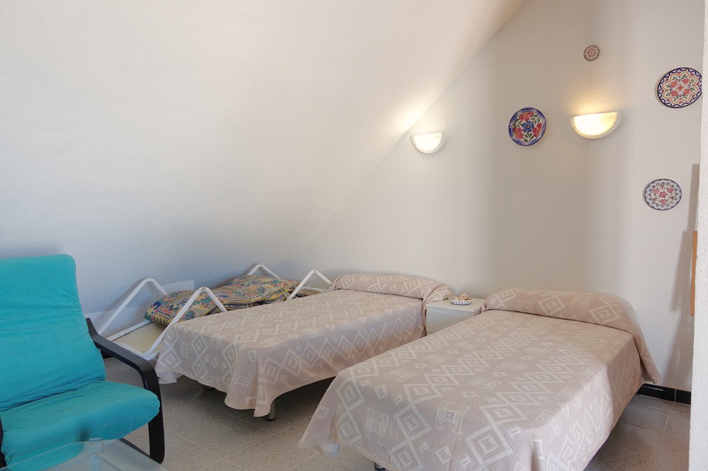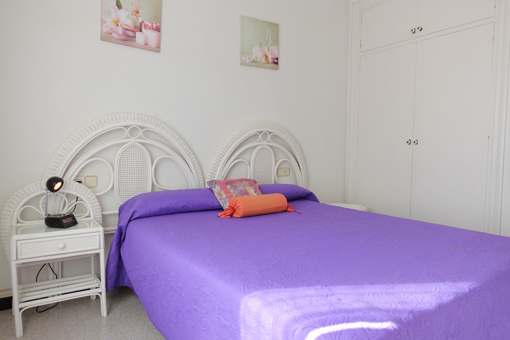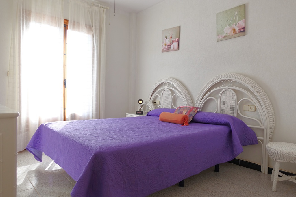 En este conjunto disponemos de un piso de 3 dormitorios tipo dúplex. En la planta principal se encuentra la cocina, 2 dormitorios dobles-uno de ellos con un bonito balconcito-, un cuarto de baño, un aseo y el salón comedor. La terraza de esta planta, a la que se accede desde el salón, tiene una escalera que accede a la otra planta del inmueble, con una gran terraza-solarium y con acceso a un gran dormitorio con 4 camas y zona de estar, que incluye también un cuarto de baño. También incluye cochera y la urbanización cuenta con piscina* comunitaria. Está amueblado y habilitado con toda la ropa de cama, toallas de baño y lavabo, así como menaje según capacidad.